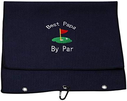Towel with saying: Best Papa/Dad By Par. Silver grommet and hook to hang towel off bag