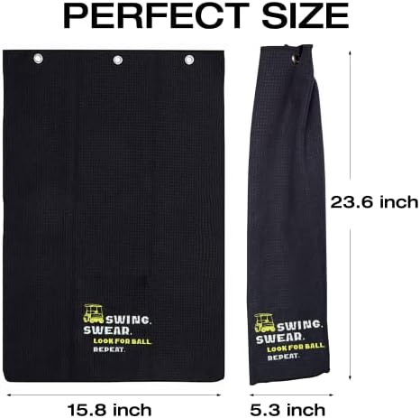 【HUMANIZED DESIGN】: 15.8 inches * 23.6 inches (TIPS: manual measurement tolerance.)with a triple fold center grommet and a heavy duty carabiner clip to attach to your golf bag to prevent the clip from loosening and towel loss. very convenient to use and carry, saving the space of your golf bag.