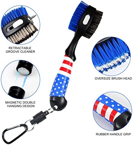 3. GOLF BRUSH- Golf club cleaner brush is made of durable plastic handle, double-side brushed with wire bristles from one side to clean irons and hybrids and nylon bristles from the other side to clean woods without scratches and retractable spike.The retractable spike helps clean deep in grooves and golf shoes